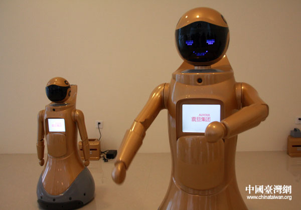 震旦館內(nèi)還展出了三個(gè)機(jī)器人“震旦小子”,寓意震旦未來(lái)向高科技領(lǐng)域發(fā)展。(中國(guó)臺(tái)灣網(wǎng) 鐘寶華 攝)