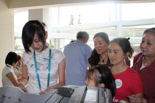 震旦館的敲章處和其他館最大的不同是,除了為參觀游客在世博護照上面敲章外,還可免費為游客打印一張個性風景照并在上面敲章。在敲章處的墻壁上,掛著三幅風景畫,分別是外灘全景、良渚文化遺址和紅山文化遺址。游客可以任選其中一幅來打印并敲章。在靠墻的地方,整齊的放著四部運轉中的打印機。