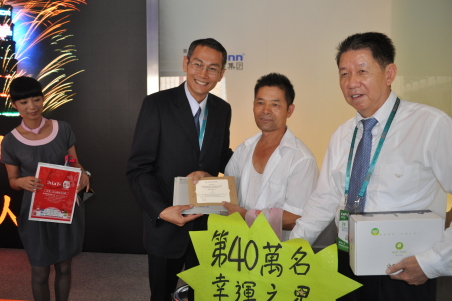 在現場的歡呼聲中,工作人員獻上“第40萬名幸運之星”的牌子,臺北館館長陳慶安也特別致贈臺北名產鳳梨酥、數碼相框、臺北國際花卉博覽會的邀請卡及花博一日劵二張等禮物給幸運的林金火先生。陳館長也不忘提醒大家,重要的是在上海世博會之后,臺北花博即將于11月6日展開,他邀請大家“相約臺北花博見!”,也歡迎大家到臺北觀光。同時陳館長也宣布同梯次參觀的游客通通有獎,每位都可以在互動體驗區拍攝臺北景點合成照,引起全場鼓掌。而臺北館陳館長也透露臺北館第50萬名幸運臺北館將會送出更多大獎。