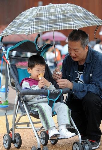 5月14日,一位游客在上海世博園內(nèi)為孩子遮雨。當(dāng)日,上海市的降雨天氣并沒(méi)有影響游客游覽的興致,雨中洋溢著的濃濃溫情讓人感動(dòng)。(新華社記者 徐家軍/攝)
