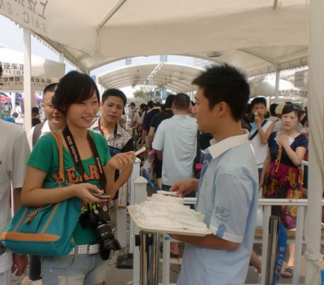 隨著近日高溫天氣的出現,汽車館在降溫措施方面進一步提高了人性化的服務,根據氣溫的高低,在35度以上的天氣,每天下午從13:00至17:00在戶外排隊區域的1-2號蓬為排隊等候的觀眾發放冷毛巾,以便大家擦汗、降溫,每天預計發放3000條,并且在38度以上的天氣,每天14:00給戶外1-2號蓬排隊的觀眾發送冰塊,讓大家用小毛巾包著冰塊,以便降溫防暑,每天預計發出500份。另外,汽車館為減少老人在酷暑中等待的時間,在戶外排隊區域,在高溫天氣的幾個高溫時段,為排隊中的75歲以上的老人發放當天的預約券。