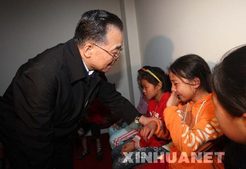 5月13日,溫家寶總理在四川綿陽九洲體育館地震災(zāi)民安置點(diǎn)看望災(zāi)民。這是溫家寶安慰在地震中失去親人的孩子們。 新華社記者 姚大偉 攝