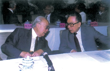 圖1錢偉長會(huì)長(左)與全國政協(xié)副主席吳學(xué)謙在主席臺(tái)親切交談。