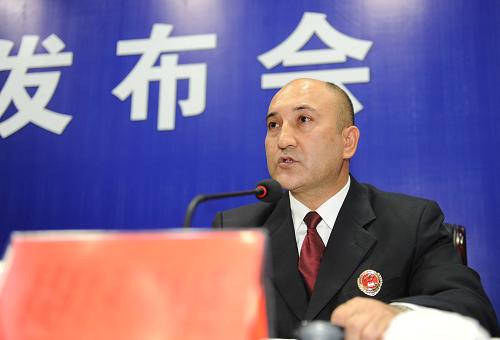 8月4日,烏魯木齊市人民檢察院檢察長吾提庫爾·阿不都熱合曼在新聞發布會上通報情況。當日,吾提庫爾·阿不都熱合曼在烏魯木齊舉行的新聞發布會上宣布,截至8月3日,經檢察機關嚴格依法審核、查證,烏魯木齊“7·5”事件首批83名犯罪嫌疑人被批準逮捕。  新華社記者 沙達提 攝
