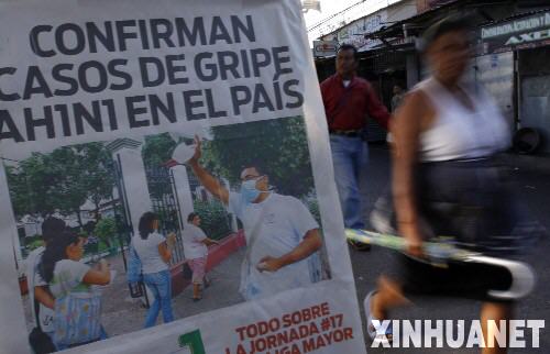 5月4日, 在薩爾瓦多首都圣薩爾瓦多,一名當?shù)厝藦囊粋關于甲型H1N1流感疫情的告示牌前走過。薩爾瓦多目前已有兩名患者被證實感染甲型H1N1流感病毒,政府稱已經(jīng)采取相應措施以防止疫情擴散。 新華社發(fā)(奧斯卡·斯里維拉攝)