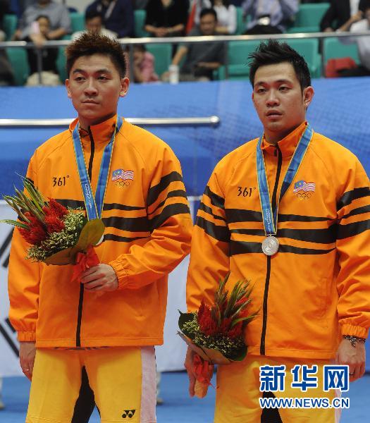 11月20日,馬來西亞選手古健杰(右)/陳文宏在領獎臺上。當日,在第16屆亞運會羽毛球男子雙打決賽中,古健杰/陳文宏以1比2不敵印度尼西亞選手馬爾基斯·基多/亨德拉·塞蒂亞萬,獲得亞軍。新華社記者盧漢欣攝