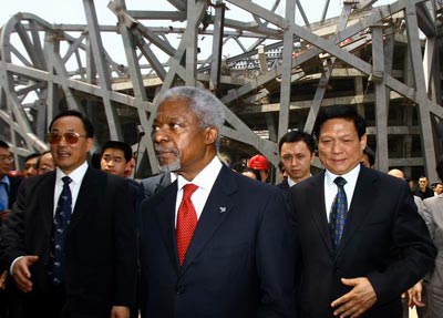 5月23日訊 上午,正在北京訪問的聯合國秘書長安南在北京奧組委主席劉淇的陪同下參觀了建設中的國家體育場。安南對北京奧運場館的設計、建設工作給予了高度評價。