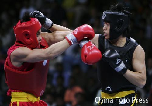 12月14日,多哈亞運男子武術散手-65公斤級的比賽中,中國選手趙光勇摘金牌。圖為本次比賽精彩圖。