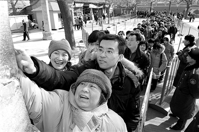 記者在現(xiàn)場看到,為了緩解售票窗口的壓力,白云觀特地派出了流動售票車分流購票人流。在白云觀入口處,凡是準(zhǔn)備摸石猴的市民都要按秩序排隊。維持秩序的保安一個勁兒地用擴音器喊“摸一下就走,不要停留”。
