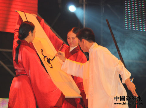 孔廟古琴教師朱慧鵬為兩岸師生作了太極舞劍和古琴表演,他表示,孔子倡導“六藝”,希望兩岸師生以傳統文化為紐帶,促進兩岸青少年的了解和友誼。他在舞劍表演時,一手持劍一手書寫漢字“和”,就是希望兩岸共建和諧中華。