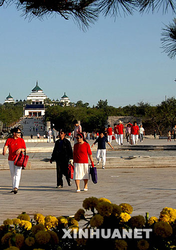 烏蘭浩特市的市民在成吉思汗廟廣場休閑(7月28日攝)。新華社記者 李欣 攝