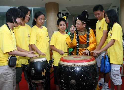 7月8日,參加中國尋根西安之旅夏令營的華裔青少年在西安博物院與樂師一起打鼓。