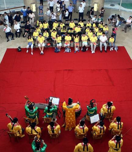 7月8日,參加中國尋根西安之旅夏令營的華裔青少年在西安博物院欣賞長安古樂表演。