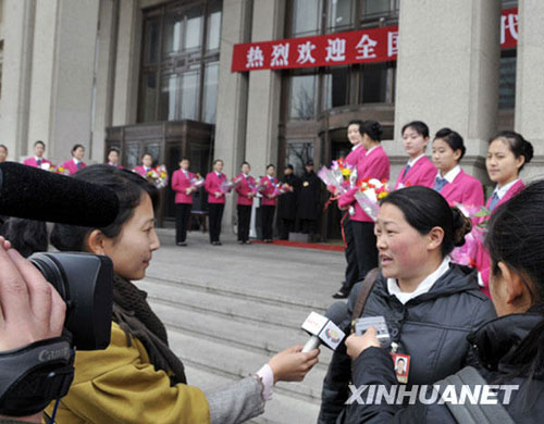 3月2日,出席十一屆全國人大二次會議的西藏代表團抵達北京。這是全國人大代表曉紅(珞巴族)在駐地接受記者采訪。
