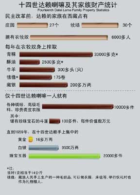 民主改革前,十四世達賴家族在西藏占有27座莊園、30個牧場,擁有農奴6000多人。每年在農奴身上榨取青稞33000多克(1克相當于14公斤)、酥油2500多克、藏銀200多萬兩、牛羊300頭、氆氌175卷。1959年,十四世達賴喇嘛本人手上有黃金16萬兩、白銀9500萬兩、珠寶玉器2萬多件,有各種綢緞、珍貴裘皮衣服1萬多件,其中價值數萬元的鑲有珍珠寶石的斗篷100多件。作為舊西藏最大的農奴主十四世達賴的累累罪惡罄竹難書——