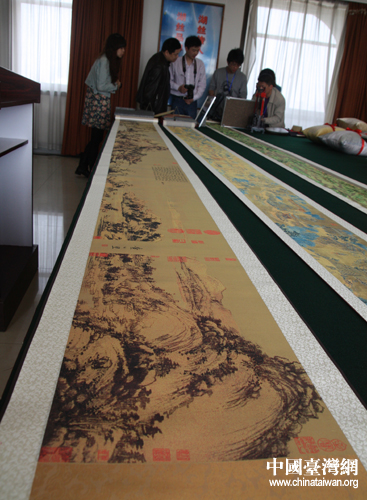 中國(guó)臺(tái)灣網(wǎng)4月26日湖州消息 一幅名卷展世博,兩岸深情盼團(tuán)圓。25日,由人民網(wǎng)、中國(guó)臺(tái)灣網(wǎng)等23家網(wǎng)絡(luò)媒體組成的“全國(guó)知名網(wǎng)絡(luò)媒體浙江行”記者一行,走進(jìn)了為世博會(huì)研制永久陳列絲綢國(guó)寶的絲綢之路集團(tuán),在60多件獻(xiàn)禮世博會(huì)的絲綢精品中,兩卷合一的絲綢織錦畫(huà)長(zhǎng)卷《富春山居圖》引人注目。